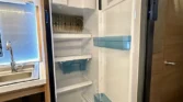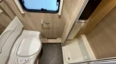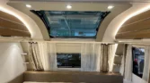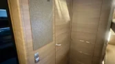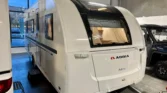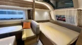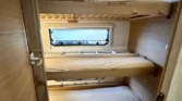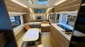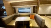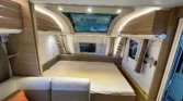 Bellissima roulotte familiare con un letto matrimoniale nella parte anteriore, una dinette centrale, letti a castello e un bagno con box doccia nella parte posteriore del veicolo.