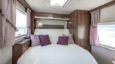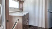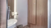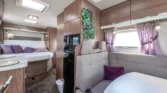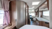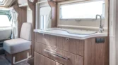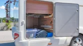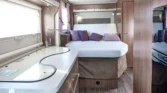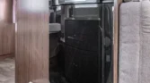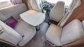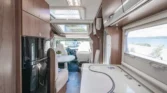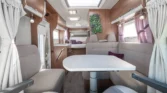 Internamente, questo camper è caratterizzato da un design con elementi in legno marrone e comodi cuscini in tessuto beige. Gli interni moderni sono caratterizzati da bellissimi dettagli in beige e argento, che creano un’atmosfera calda e accogliente. Il tavolo regolabile vicino alla zona salotto, con una bella cornice bianca, offre ulteriore flessibilità e comfort e può essere ripiegato per creare un ulteriore spazio per dormire.
